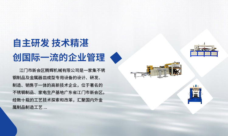 江門市新會區(qū)騰輝機械有限公司是一家集不銹鋼制品及金屬器皿成型專用設(shè)備的設(shè)計、研發(fā)、制造、銷售于一體的高新技術(shù)企業(yè),位于著名的不銹鋼制品、家電生產(chǎn)基地廣東省江門市新會區(qū)。經(jīng)數(shù)十載的工藝技術(shù)探索和改革,匯聚國內(nèi)外金屬制品制造工藝。
